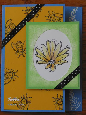Stamps: In Full Bloom Paper: Ballet Blue, Green Galore, Summer Sun, White Ink: Basic Black, Green Galore, Only Orange, Summer Sun, Whisper White Craft Accessories: Aqua Painter, ribbon, oval cutter, Line detail white embossing powder (Embossing Arts), sponge, dimensionals