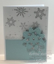 My friend Amanda shared a snowflake element she made using a picture she found on the internet. I thought that element would be perfect for the circle element in the sketch. I made the element and used some of the Holidays Fancy Foil Designer Vellum with the snowflakes on the top portion of the card. I then embossed a piece of Soft Sky with the Softly Falling embossing folder for the bottom. I added a strip of the white glitter ribbon and added my snowflake element. Here is another card my ladies will make in my next workshop.