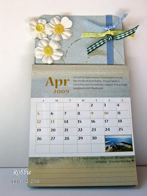 For today though I have 2 quick projects for you. The first is a going green project (there was a challenge somewhere but I can’t find it now 🙁 ). I received in the mail a magnetic refrigerator calendar from a local realtor. I know we all get them, the kind with the agents picture on it. I thought it would be cute to use it and remake the top. I took a scrap of designer series paper and covered the agents picture. Next I added some paper flowers I had gotten at the $1 spot at Target. I put buttons in the center, added ribbon and I was done. It was super quick and required very minimal supplies. Here is my creation.