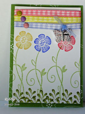 Stamps: Itty Bitty Buds (hostess) Paper: white, Delicate Dots DS (SAB) Ink: Certainly Celery, Lovely Lilac, Old Olive, Regal Rose, So Saffron Accessories: ribbon and brads (Pink Hedgehog), butterfly charm (Michael’s – jewelry section), sticky tape, dimensionals