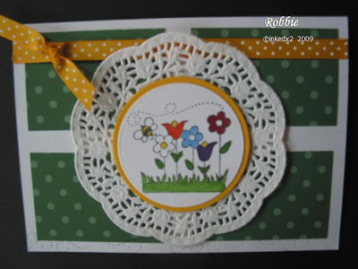 Robbie I really like this card. The layout was great. I especially liked the flower stamp, color combination, and doily. Congratulations on your 5,000 hits. Sandy