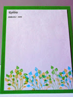 Then I had to begin to put my card together. I matched the ink with Green Galore and mounted the embossed piece on the card. I had just a little of this black and white polka dot ribbon left so I put it across the bottom. After I put on my ribbon I thought it would be interesting to stamp an image in black. I then used my ink pad to ink the edges of the stamped image and mounted it on black. It still needed something so I chose 3 colors that matched to make layers for underneath. I used pop dots to attach the 3 layers of color and then used pop dots to attach the stamped image on the top.