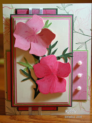 Loved this card. Just absolutely beautiful, so feminine and delicate. The colors, layout, stamps used were a wonderful combination. Sandy