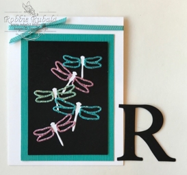 I had these white dragonflies sitting on my desk and I wondered what it would look like if I inlaid them in black and used the glimmer paper for the outline of the wings. There was a lot of die cutting and then paper piecing. Good thing I had my Tombow multipurpose glue! This one has a different look than the one from the other day. I like the look of this one also. Here is the other idea.