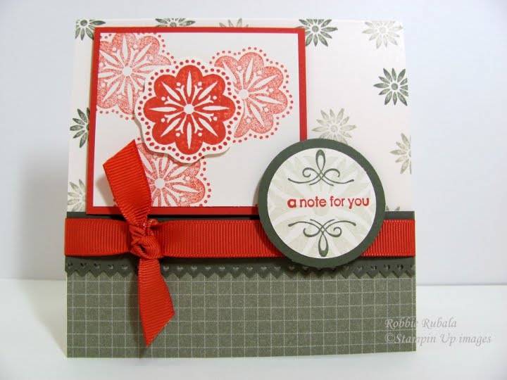 Stamps: Baroque Motifs, Elegant Thank You, Sweet Little Sentiments (retired) Paper: Always Artichoke, Dusty Durango, Very Vanilla, Patterns Pack III DS Ink: Always Artichoke, Dusty Durango, Mellow Moss Accessories: 1 3/4″ circle punch, Pinking Hearts border punch, Dusty Durango polka dot ribbon, sticky tape, dimensionals