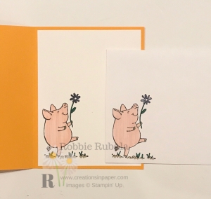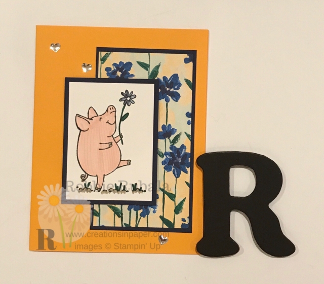I am continuing with the next stamp set I have that is in the catalog. The next set was the This Little Piggy. This is not a set I was fond of when it first came out. I was not going to order it but made a mistake with another order and ended up with 2. I kept the set and started playing with it. I love all the cards I have made with it. It is turning out to be one of my favorite sets to play with. I began by stamping the pig with the flower. This pig is so cute and so fun dancing around with that flower. I colored him using markers. I thought the flower looked like the flowers on one of the pieces of Garden Impressions designer series paper so I decided to pair them. One of the colors in the designer series paper is Mango Medley so I chose to use it for my card base. I used Night of Navy for my panel layers. The pig image is mounted with dimensionals to add some interest. To finish my card I added some silver metallic hearts. Here is the completed Stampin’ Up This Little Piggy Flower creation.