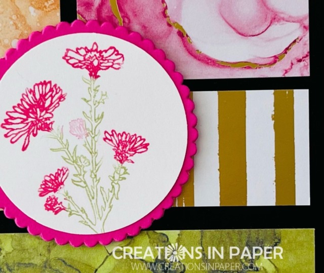 Expressions in Ink pattern paper: 2″ x 4″ – the green pattern and 1 3/4″ x 3″ – the Pale Papaya pattern and 1 7/8″ x 2″ – the pink and gold foil pattern and 1″ x 2″ – the gold foil striped pattern