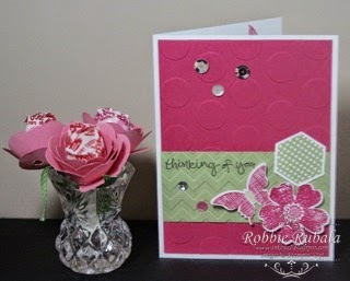 I thought about what I could do to step up my card. I knew I could use a white card base and add a melon layer. I wanted to do some other things so I decided to emboss the melon layer as well as the pear strip. I knew I could use the large polka dot embossing folder for the melon layer. I then wanted to add embossing to pear strip so I pulled out my chevron embossing folder for it. When it was finished it needed some bling to me so I added some sequins. Here is my stepped up version.