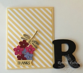 I pulled out my Petite Petals stamp set and matching punch. I stamped the flowers on the card stock with matching ink. I then used the punch to punch them out. I laid them on my card to get an idea what I wanted it to look like. When I was happy with the placement, I used glue dots and stampin’ dimensionals to attach them to my card. I then stamped and punched my sentiment. I still needed to address the flower in the sketch. I went looking at my stamp sets and found the dragonfly in Awesomely Artistic. I stamped it and used the Wink of Stella pen to add some sparkle. Here is my final creation.