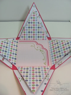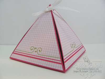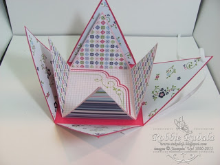 Over at Sunny Stampin Morning Donna conducts a morning chat. This is open to all stampers and we have a great time. If you get a free morning at 10 join us as we have a lot of fun. One of the activities Donna started is a biweekly challenge. We have had some fun ones in the past and this time she challenged us to make an explosion box – she tries to pick challenges that will stretch our skills. I have made explosion boxes in the past so I wanted to challenge myself by trying a different shape rather than a box. I saw on another demos blog a pyramid shaped explosion box and decided to try that one. I had to go searching for a pattern but once I found out how to cut it I was set. Here is my box I made for the challenge.