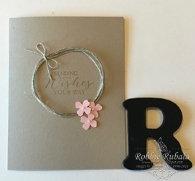 I saw a cute card in my Take Ten magazine that I thought was so cute. I wanted to see if I could recreate the card using our supplies. I went searching for a sentiment for the center. I found a good one in Butterfly Basics. I used the Soft Suede ink and a second generation stamping for the sentiment. Then I took my linen thread and wrapped it around a bottle that was big enough to create a circle that the sentiment would fit inside and tied a bow. I took some of the multipurpose glue and attached the thread ring to the card from around the sentiment. I punched some flowers and using dimensionals I attached them to the card front. I added some pearls and my card was complete. Here is my finished creation.