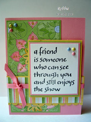Robbie I love this card. The colors and layout are just so pretty together. Keep the inspriation coming friend. Sandy