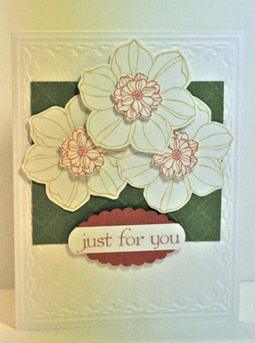 As you can see I am having issues with photographing white cardstock still. I am think I need to use a black background to avoid this. I may try photographing my cards with a black background for a while to see it that helps. The background was also made using an embossing plate from a few years ago. I don’t remember the name of it.