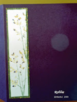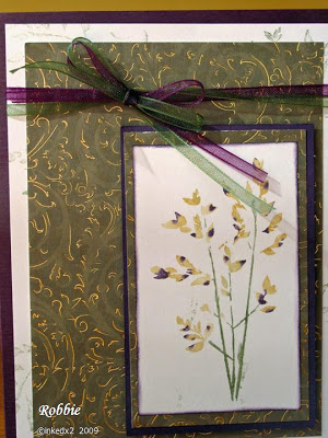 Stamps: Wild Fairy Lily (Hero Arts) Paper: purple (can’t remember), white, Sage Scroll (Sandy Lion Designs) Accessories: Always Artichoke – Elegant Eggplant – So Saffron markers, ribbon (PinkHedgehog), sponge dauber, sticky tape, dimensionals