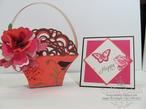 My share today is the last of my items from my trip to Boston. Donna of Butternut Sage Designs is an awesomely talented lady! She is continually playing with her supplies to come up with unique projects. One of the items she created is a cute little lacy basket. The best part is she showed us how to make it also. She made each of us a basket and the cute card below. She has placed a few chocolate nuggets in the basket. Check out this fabulous creation!