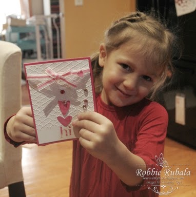 Yesterday Zoie and I finished up her Valentine’s and made treat bags for everyone. We used some of my Paper Pumpkin pieces as there was more than I would have used. She had a great time doing this as well as her treat bags. Here are a couple of pictures I took when she was working on it and with the finished Valentine.