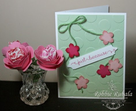 Today is the challenge at The Paper Plunge. Our challenge this week is all about the May flowers the April Showers gave us. This week we were to create a project that had flowers on it. Since I was late in making this, I went with a simple, quick card. I think I made this one in about 10 minutes. I had an idea all I needed was the time to do it. After I made the card base it needed a sentiment so I added a quick generic one. Here is my creation.