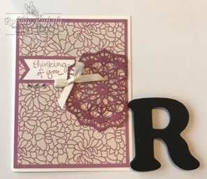 When I saw the large circle I thought of the Lace Doilies in the Occasions catalog. These doilies are great as they have a vanilla side and a white side. I thought the Falling In Love dsp would be great to use. I looked through the different papers and decided on one. I knew the vanilla side of the doily would be lost on the paper so I decided to use the white side and color it. I used the matching color from the paper and pushed the doily into the ink pad. Once it was colored I set it aside to dry while I worked on the rest of the card. The Very Vanilla card base was scored and cut. The layer of dsp was added to a layer of Sweet Sugarplum card stock. Dimensionals were added in key places on the doily and then the doily was added to the dsp. The edge of the doily that was hanging over the edge was trimmed. This layer was added to the Very Vanilla card base. The sentiment was inked and stamped onto a piece of Very Vanilla. I masked half of the sentiment and stamped it, then cleaned the stamp, masked the sentiment that had already been stamped, inked up the other part, and then stamped the last part of the sentiment. The sentiment was trimmed and the end was flagged using the banner punch. The sentiment was added to the card front using dimensionals. To finish the card a bow was tied and added using a glue dot as well as some rhinestones were added under the sentiment. Here is my completed creation.