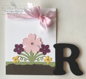 I decided to cut the edgelit out of Pear Pizzazz. I mounted it onto my Whisper White card base. Then I used the Birthday Blossoms set and stamped the single flower onto Pink Pirouette. I used the pansy punch to punch it out. Next I used the Petite Petals set to stamp one of the flowers onto Rich Razzleberry and used the matching punch to punch it out. The final flower was stamped with the retired Something to Say and punched out with the matching retired punch from Daffodil Delight. I then used glue dots to attach the flowers to the sprays of the Star Blast. This gave me a flower spray. To make it look like it was in the ground, I cut a piece of Early Espresso and tore the edge. I added this over top of the Pear Pizzazz. I needed some Bling cause you know everything is better with Bling so I added some rhinestones to the center of my flowers. My flower spray was complete. To finish off my card I added a double bow of the retired Seam Binding in Pink Pirouette. Here is my completed creation.