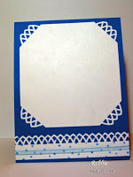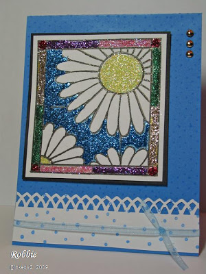Stamps: Mosiac Daisy (CarvedStamps.com), Itty Bitty Backgrounds Paper: Ballet Blue, Basic Black, white Ink: Ballet Blue, Palette Noir Black Accessories: glitter, Arch Lattice punch (Martha Stewart), ribbon and silver brads (Pink Hedgehog), sticky tape, dimensionals