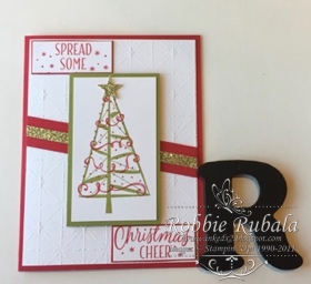 This week we have chosen to spotlight Twinkle Trees and Tin of Tag stamp sets. I stamped the tree using Old Olive. The swirls were added using Real Red ink. I used the retired Itty Bitty punch pack to punch out a star from gold glimmer paper. Not I needed to make my card base. I chose to use Real Red. I have some of the Fancy Frost Specialty designer series paper. This paper is made to be sponged to highlight the pattern. I had tried that but did not have any success so I decided to use the paper as it is. I attached this to my card base using Tear & Tape. I cut a strip of Real Red card stock and a strip of Gold Glimmer paper. I attached the red to my card base at an angle. I then added my gold glimmer paper on top centering it. I chose my sentiment and stamped it in red. It was too large for my card to make it look right so I took the sentiment and cut it in half. I mounted both pieces onto a piece of Real Red card stock. The first part of the sentiment was added to the top of the card and the last part was added to the bottom of the card. I added the tree image to the card front using dimensionals. Here is my completed creation.