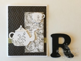 I decided to play with my Timeless Textures stamp set. I wanted to see if I could use it to create a border for the vertical panel. I stamped it around the edge and when I was done there was very little space left in the middle. I decided to use the flourish and stamp in the middle. I was originally going to cut the small cup for the flower element in the sketch. Since I did not like it I decided to try the tea pot. I cut it out and the size was better so I stamped it with the flourish from the set. I then decided to stamp the cup and add it at the upper right hand corner. Now that I had the pieces I needed a background. I pulled out a piece of the Early Espresso card stock and set the elements on it. It needed something as it was too plain. I looked at my embossing folders and chose the Boho Chic for my background. Now that I had all my pieces, I was ready to put my card together. Here is my final creation.