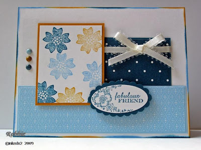 Stamps: Eastern Blooms, Oval All Paper: Bashful Blue, More Mustard, Not Quite Navy, white, Patterns Pack DS, Prints Pack DS Ink: Bashful Blue, More Mustard, Not Quite Navy Accessories: ribbon (Michael’s), Bashful Blue – More Mustard – Not Quite Navy brads (Pink Hedgehog), large oval and scalloped oval punches, sponge dauber, Zots, sticky tape, dimensionals
