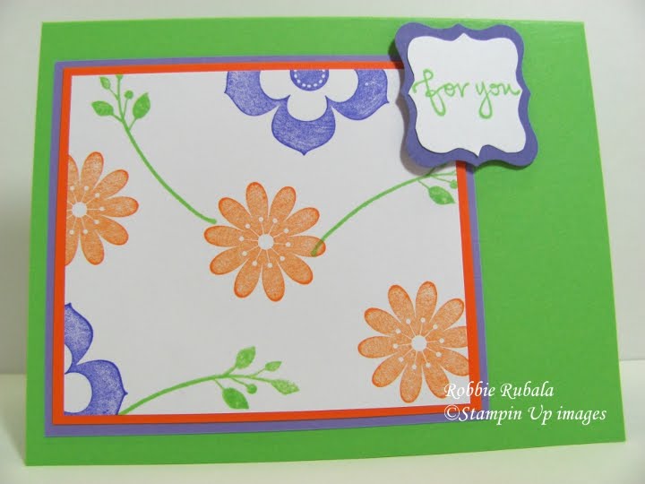 One of the challenges on Late Night Stampers is to create a card that is Easy and Demonstratable. This is a card that anyone can make when you need a quick card. I began with the sketch from Cards & Things . It was just a matter of choosing my colors. I looked at the retiring list and saw Only Orange. This is not a color I use very often (mostly at Halloween) so I thought it would be a good color choice. I then combined it with Lovely Lilac and Green Galore. Here is the sketch and my creation.