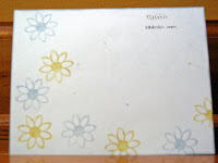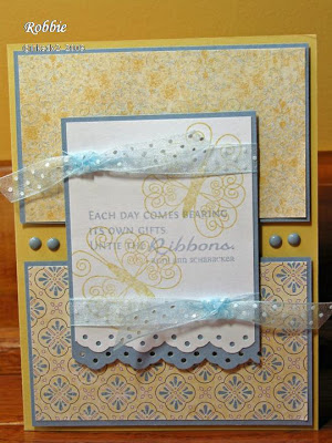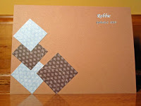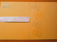 Stamps: Asian Flair, Thankful Blossoms Paper: Bordering Blue, So Saffron, white, Bella Birds DS Ink: Bordering Blue, So Saffron Accessories: Bordering Blue brads and ribbon (Pink Hedgehog), Eyelet border punch, sticky tape, dimensionals
