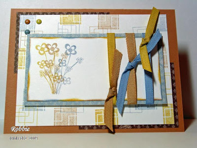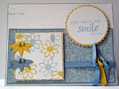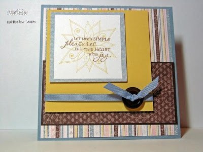 Stamps: Floral Whimsy, Thankful Blossoms Paper: Bordering Blue, So Saffron, white, Bella Birds DS Ink: Close to Cocoa, So Saffron Accessories: ribbon and button (Pink Hedgehog), sticky tape, dimensionals