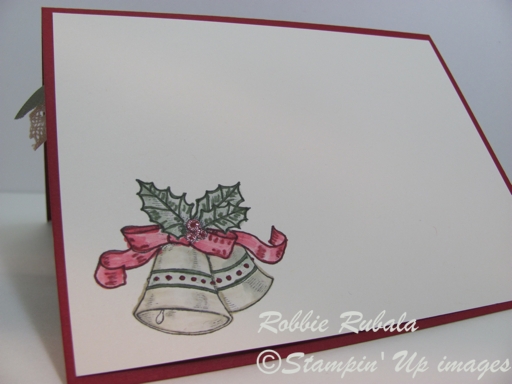 I had not used my new set Bells & Boughs yet so I decided to give it a try. I have seen some gorgeous cards using the bells and coloring with the blender pen and I wanted to give it a try. I chose to use River Rock as my neutral. I colored the bells with the River Rock and the rest was easy to decide. I used the holly stamp in Artichoke and did a second generation stamping on the background to add some interest. I also used my glitter pen to add some sparkle. I realized after I had finished my card I was supposed to do it in 15 minutes. I can tell you that it took a lot longer than 15 minutes just to do the water coloring so I failed miserably! Here is my creation.