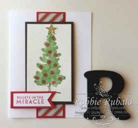 When I looked at the picture I saw watercolor right away. I decided to see if I had a stamp I could use to do the faux watercolor technique. There is a pine tree in Lovely As a Tree that I wanted to try. I stamped the tree using Garden Green on watercolor paper. I then used my aqua painter to add water to all the branches. When it was dry I used my Early Espresso marker and the writing end to add the trunk lines back in. I also used it for ground. I then used the dot from the Fresh Fruit stamp set to add some Christmas balls.