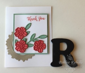 I began with the Rose Wonder stamp set. I stamped the leaf spray and the flower. I then used the framelits to cut them out. I did not pay attention, but the framelits do not cut around the shape but rather cuts an outline. So I had to start again. I stamped the leaf spray and flower and fussy cut them out. I then took the framelits and cut them out in Real Red and Mint Macaron. I sponged the Mint Macaron with the same color ink to make it a little darker. I then applied Tombow Multipurpose glue to the framelits and added them on top of the stamped images. I created my main panel and stamped the sentiment.