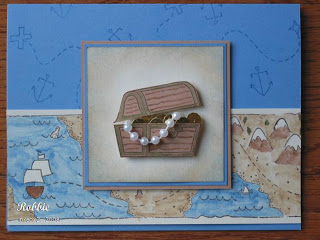 Stamps: Ahoy, Matey Paper: Brocade Blue, Creamy Caramel, Gold Metalic, Very Vanilla Ink: Brocade Blue, Close to Cocoa, Creamy Caramel, Glorious Green, StazOn Timber Brown Accessories: liquid gold pen, string of pearls (bridal section of Michael’s), 1/4″ circle punch, aqua painter, sponge, sticky strip, dimensionals