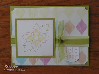 I hadn’t had a chance to play with the set I got from VerveVisual so I decided today would a good day. I used the sketch from PoeticArtistry to create this Spring card (if the weather won’t cooperate we can at least have in our cards). After I was all finished I realized I did not use brads on the corners. Oh well I’ll call it creative license. Here is the sketch and my card.