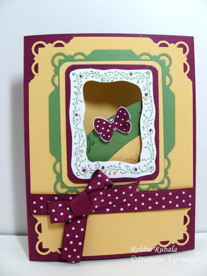 I have the set Matchbox Messages. I have linked the title to the catalog and you can find it on page 119. My first project is a card I made that uses a cute fold down flap on the inside and a cut away window on the front. I thought it would be fun to use the frame to create a window to the inside of the card. You are going to love it!