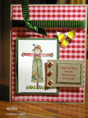 What a darling card. Love that little scarecrow and the cute little candy corns. Thanks for playing! 🙂