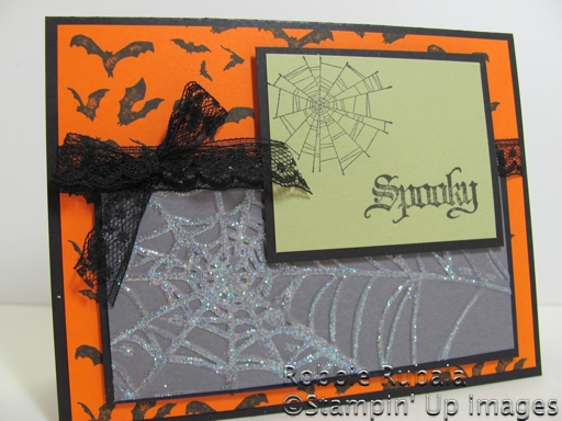 I got the idea for the spider web from someone’s blog. After I embossed it I took the 2 way glue pen and highlighted all the raised portion. Then I sprinkled glitter on it. It is really sparkly and looks like a web in the dew in the morning.