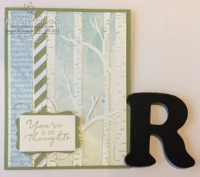 I took the embossing folder and on the back side, I used my ink pad and added Soft Sky and Pear Pizzazz ink. Paper was added to the opposite side and the folder was closed and then it was embossed. When I took it out I had the trees embossed with the sky and ground lightly colored. I pulled out my Subtles paper stack and chose a patterned paper in each color. Strips were cut and then added to the left hand side. This panel was added to my Pear Pizzazz card base. I needed a sentiment so I looked at my Watercolor Wishes card kit stamp set and found one that was perfect. It was stamped onto Very Vanilla and then mounted onto a decorative label punch. The sentiment was added to the card using dimensionals. Here is my completed creation.