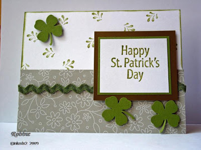 Stamps: Itty Bitty Buds (hostess), All Year Cheer III (retired), Shamrock (Hero Arts) Paper: Old Olive, white, Delicate Dots DS (SAB), paint chip Ink: Old Olive, Versamark Accessories: ric rac ( Jody’s online share), shamrock punch (Martha Stewart), clear & Rainbow Razzle embossing powders, sponge dauber, sticky tape, dimensionals