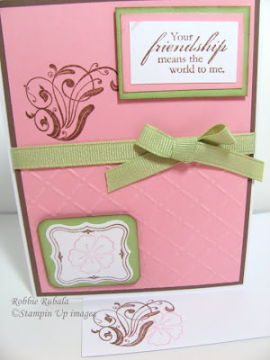 Stamps: Wings of Friendship, Vintage Labels Paper: Certainly Celery, Close to Cocoa, Pretty in Pink, white Ink: Certainly Celery, Close to Cocoa, Pretty in Pink Accessories: Certainly Celery grosgrain ribbon, Curly Label punch, Perfect Details Texturz plate, dimensionals