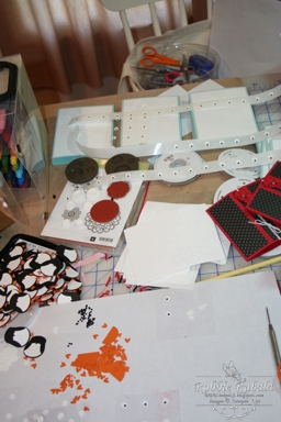 I talked to you about all my work over the weekend on my swaps for convention. I took a picture of my desk to show you how messy I am when I craft. Here is that picture.