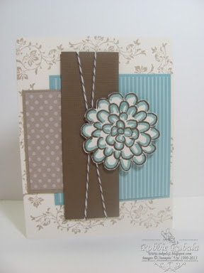I saw on someone’s blog how they stamped the flower from Flower Fest and then used the marker to trace the inside of the petals. They had done the flower in blues. I decided to use Soft Suede to stamp it and Baja Breeze to trace the petals. This is the first time I have used the baker’s twine. I have both the brown and cherry and have not used it. Every time I go to use it, it just doesn’t look right. I have to say it looks fine this way. Just need to experiment more and see if it works. Here is what I created.